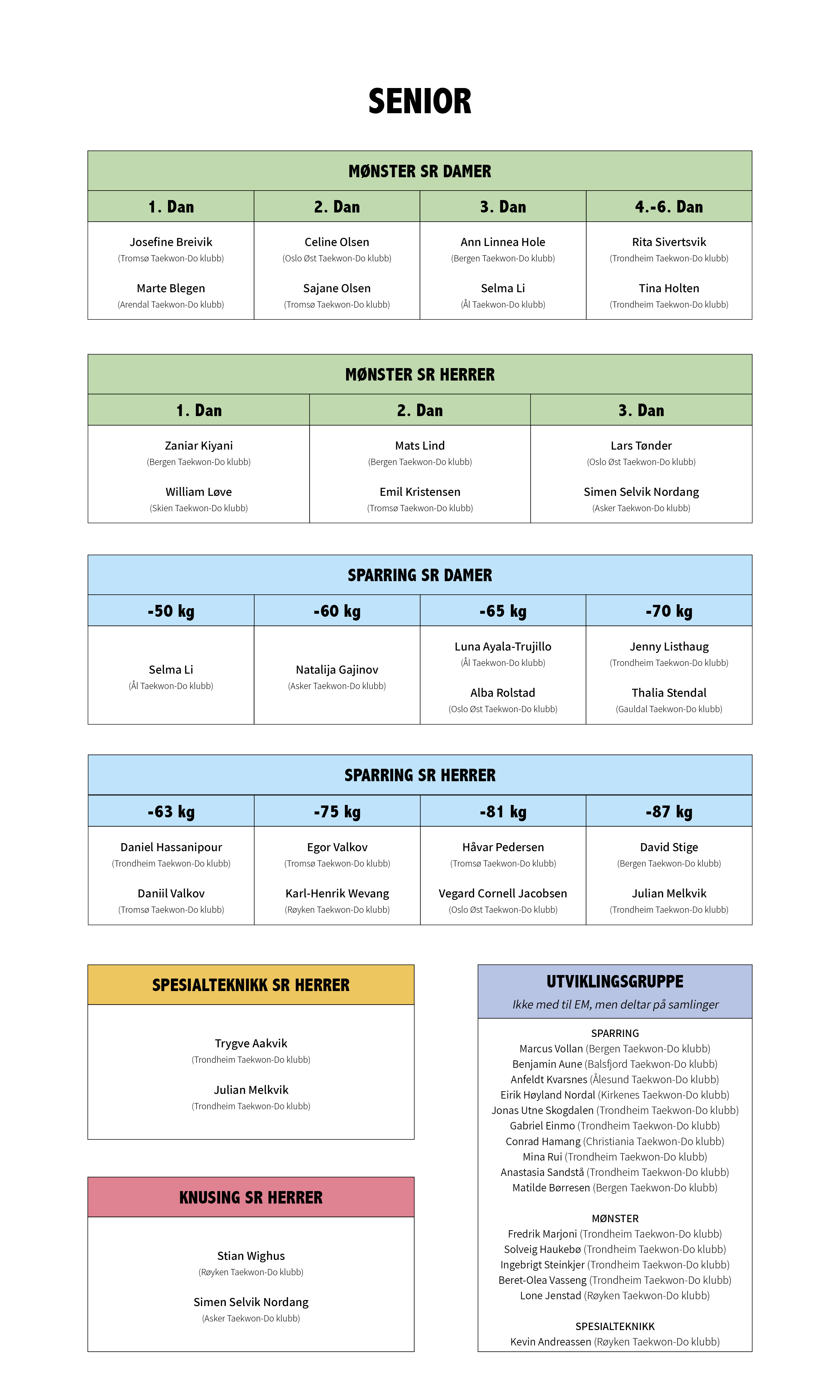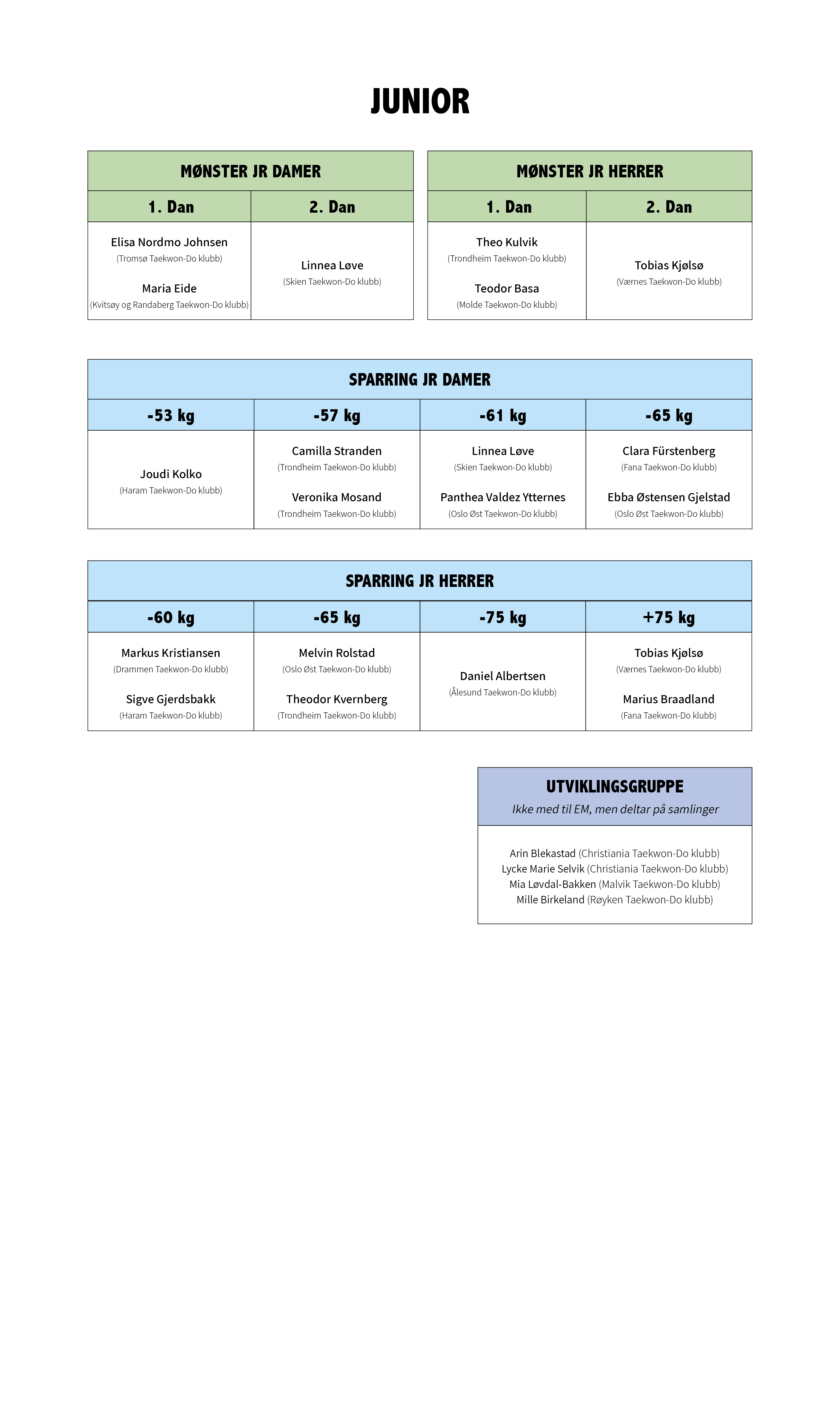 Medlemsinfo Avdelinger Treningstider Ekstratreninger Priser og betalingsmåte Terminliste Gradering Landslag NTNs instruktørkurs Åpningstider i resepsjonen Filer Utmelding Landslag LANDSLAGET 2026